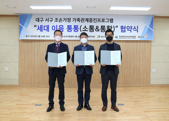 [로컬세계 박세환 기자]대구 서구청은 16일 오전 10시, 서부교육지원청, 서구가족센터와 함께 모든 가정이 차별받지 않고 행복한 사회를 만들어가기 위한 조손가정 가족관계증진‘세대 이음 통통(소통&통합)’사업 업무협약을 체결했다.