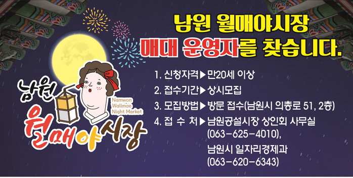 [로컬세계 이태술 기자]전북 남원시가 다양한 먹거리와 화려한 볼거리가 가득한 남원의 대표적인 야간 관광명소인 '월매야시장'에서 꿈과 열정을 펼칠 판매대 운영자를 모집한다고 31일 밝혔다.