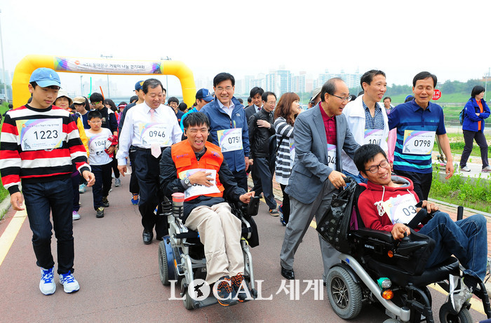 ▲ 거북이 나눔 걷기대회에 참석한 유덕열(가운데) 동대문구청장이 장애인들과 함께하고 있다 © 로컬세계 |