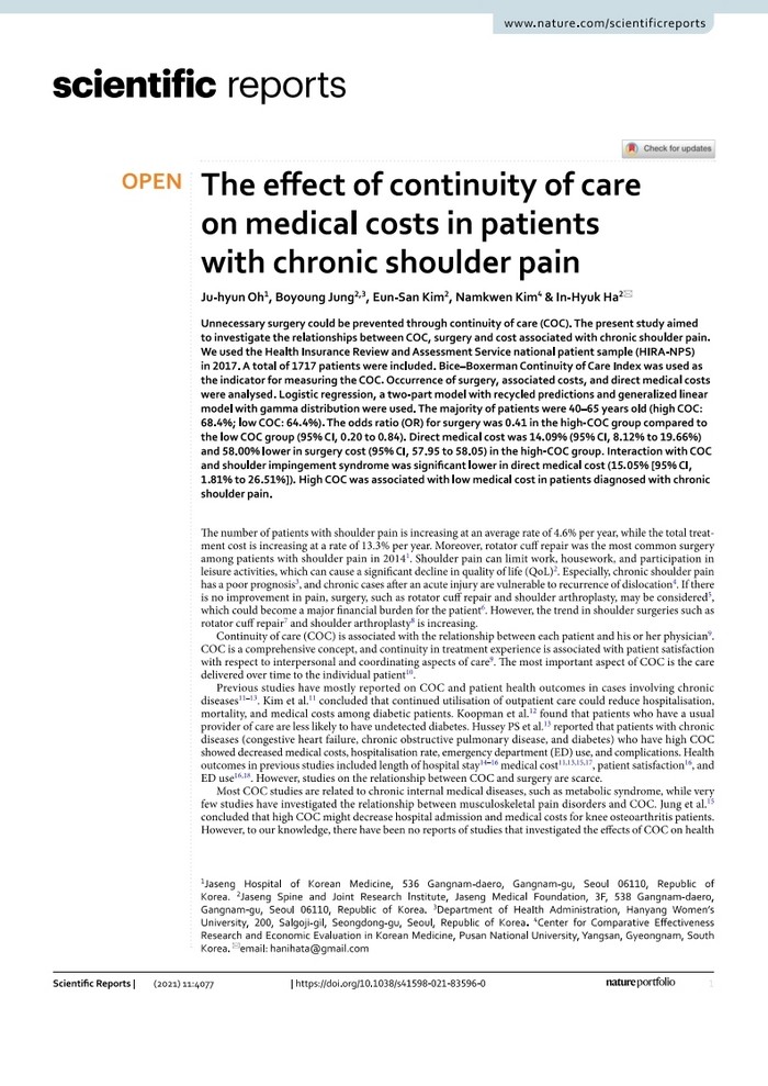 ▲‘Scientific Reports(IF=3.998)’ 2021년 2월호에 게재된 해당 연구 논문 「The effects of continuity of care on medical costs in patients with shoulder lesions: analysis of Health Insurance Review & Assessment Service - National Patient Sample (2017-HIRA-NPS)」 |