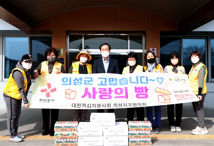 [로컬세계 박상진 기자]대한적십자사의성지회(회장 최영숙)는 지난 7일, 의성군청 전정에서 회원 15명과 함께 빵 나눔 봉사활동을 전개했다.