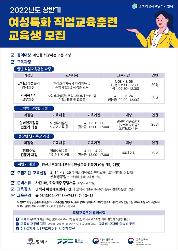 [로컬세계 김병민 기자]경기 평택여성새로일하기센터는 경력단절여성의 취업역량을 강화하고 지역사회 및 산업체 요구에 적합한 여성인력을 양성하기 위해 2022년 여성특화 직업교육훈련을 실시한다.