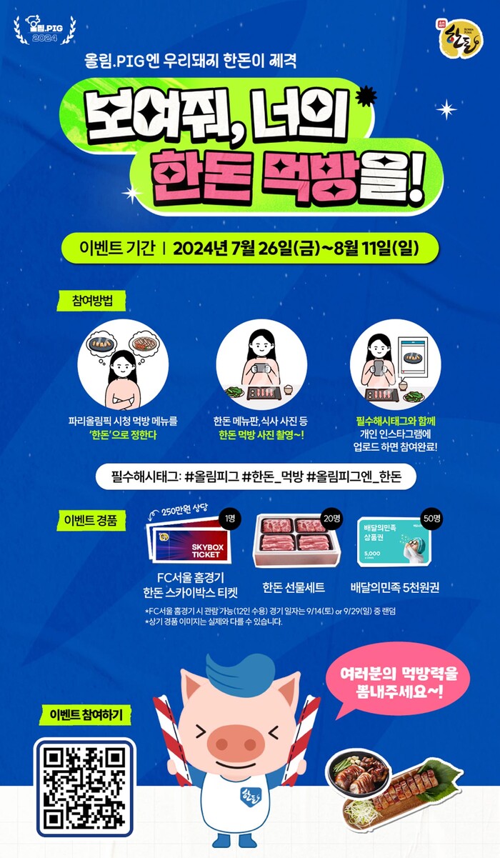 맛도 좋고, 피로회복에 좋은 우리돼지 한돈을 올림픽 시즌 동안 더욱 많이 즐길 수 있도록 한돈자조금은 오는 8월 11일까지 ‘보여줘, 너의 한돈 먹방을! 이벤트를 진행 중이다. 올림픽 기간에 한돈 먹는 모습을 개인 인스타그램 계정에 인증하면 추첨을 통해 FC서울 한돈 스카이박스 티켓, 한돈선물세트, 배달의민족 5천원 쿠폰 등 푸짐한 선물을 받을 수 있다.