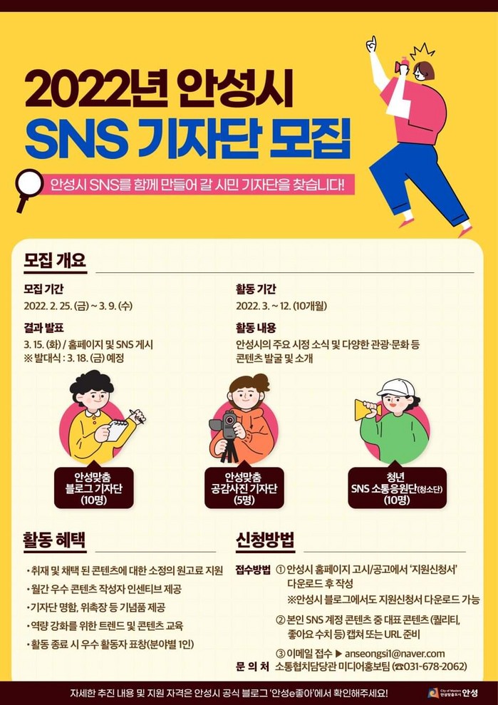 모집 분야는 ▲블로그에 콘텐츠를 제공하는 ‘안성맞춤 블로그 기자단’ ▲사진을 제공하는 ‘안성맞춤 공감사진 기자단’ ▲시 SNS를 홍보하고 새로운 콘텐츠를 제안하는 ‘청년SNS소통응원단’으로, 3개 분야 총 25명을 선발한다.