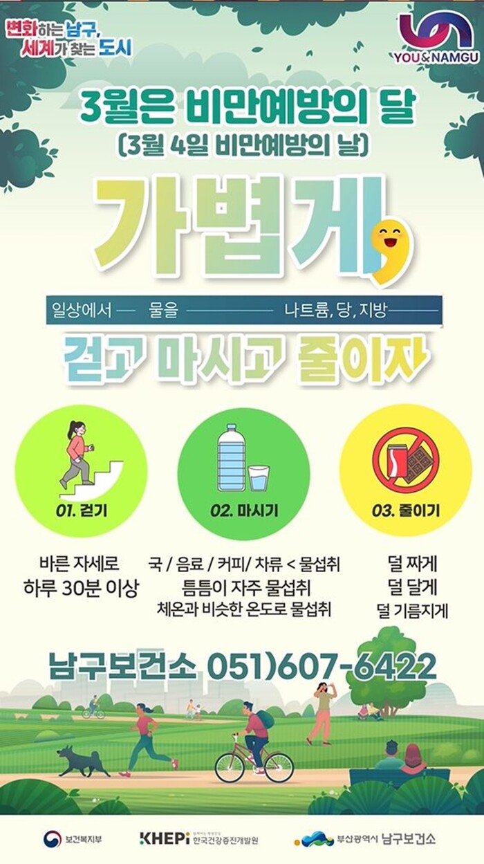 [로컬세계 부산=맹화찬 기자]부산시 남구(오은택 구청장) 보건소는 '2024년 비만예방의 달'을 맞이해 '가볍게 걷고 마시고, 줄이자'라는 슬로건 아래 3,4월간 다양한 홍보활동과 프로그램을 운영한다고 19일 밝혔다.