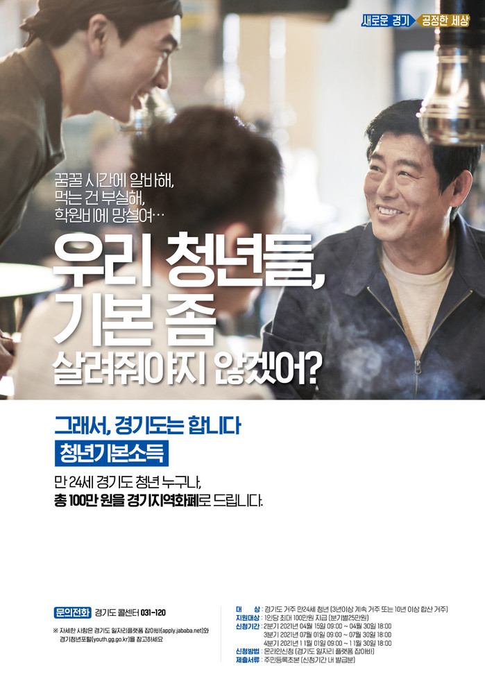 경기도 청년기본소득 만 24세 청년에게 분기별 25만원씩 연간 최대 100만원을 지역화폐로 지급하는 사업이다.