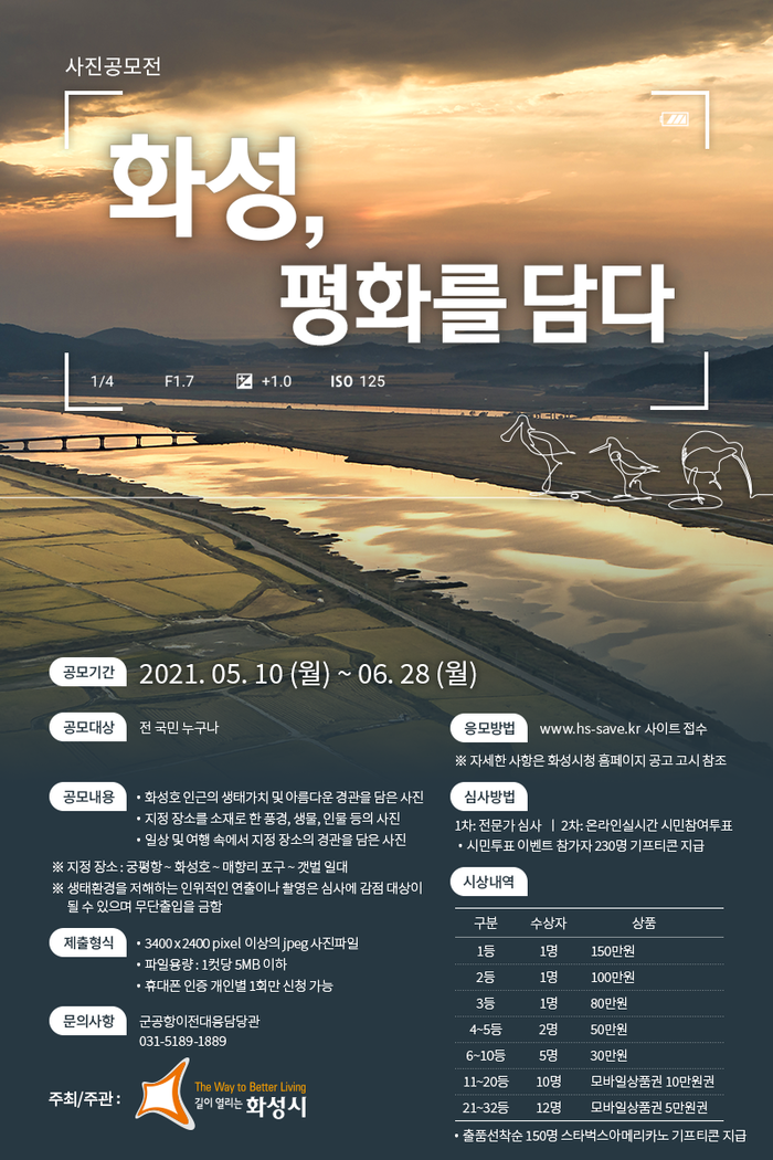 시 군공항이전대응담당관은 “‘화성, 평화를 담다’ 공모전은 시민들의 참여로 완성되는 만큼, 이번 계기로 화성호의 아름다운 경관이 사진을 통해 더욱 많은 시민 여러분에게 친숙하게 다가가는 계기가 되길 기대한다”고 말했다.