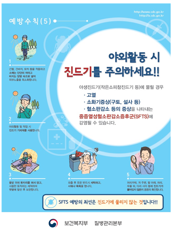 SFTS는 예방백신과 치료제가 없기 때문에 농작업, 등산 등 야외활동 시 진드기에 물리지 않도록 예방하는 것이 최선의 예방법이다.
