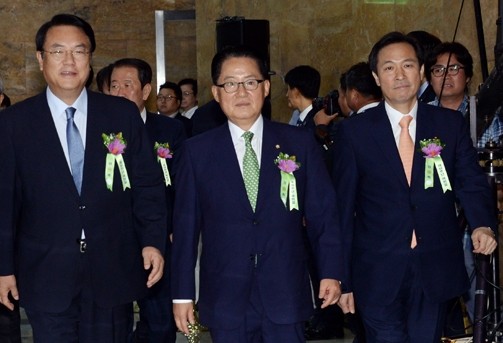 ▲정진석 새누리당 원내대표, 박지원 국민의당 원내대표, 우상호 더불어민주당 원내대표(왼쪽부터)가 제헌절 경축식에 참석하고 있다. |