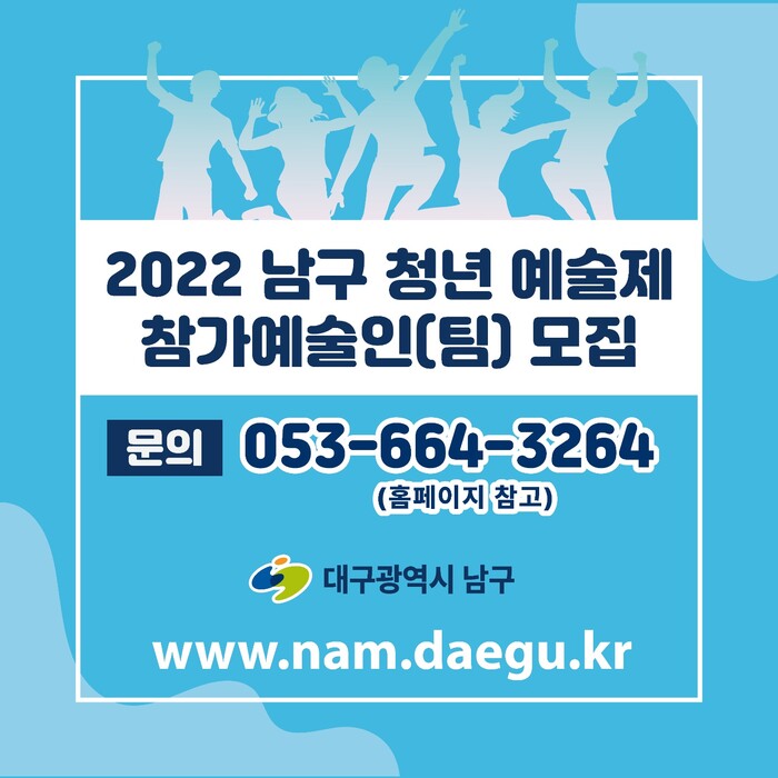 [로컬세계=박세환 기자] 대구 남구청(구청장 조재구)은 지역 청년예술인들의 상상과 호기심을 장르 간 협업과 실험으로 펼쳐 보이는 '2022 남구 청년예술제'에 참가팀을 모집한다고 2일 밝혔다.