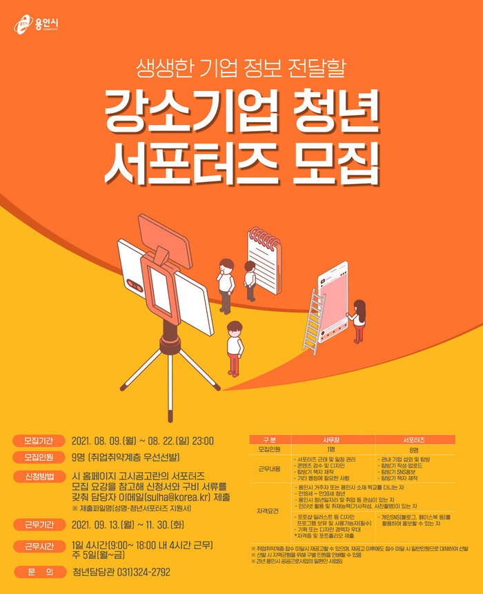 [로컬세계 김병민 기자]경기 용인시는 오는 9일부터 22일까지 지역 내 강소기업을 취재해 생생하게 전달할 ‘강소기업 청년 서포터즈’ 9명을 모집한다고 6일 밝혔다.