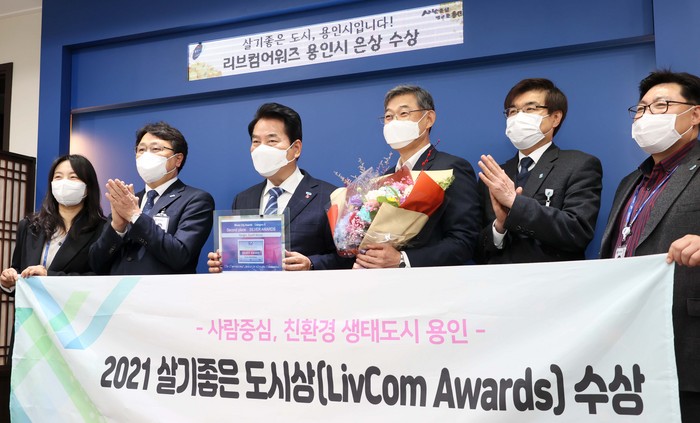 | ▲용인시가 8일 UN환경계획(UNEP)이 공인하는 국제대회, 리브컴 어워즈(LivCom Awards)에서‘살기좋은 도시상(Whole city Award)’부문 은상을 수상했다. 용인시 제공 |