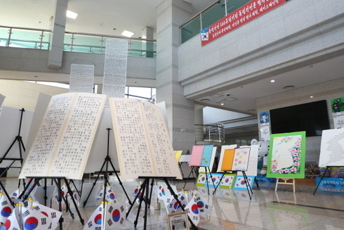 전시된 작품은 강릉시민 250여명이 참여해 색지와 한지 등에 정성껏 필사한 독립선언문 원본과 한글 해석본 55점, 직접 그린 태극기다.