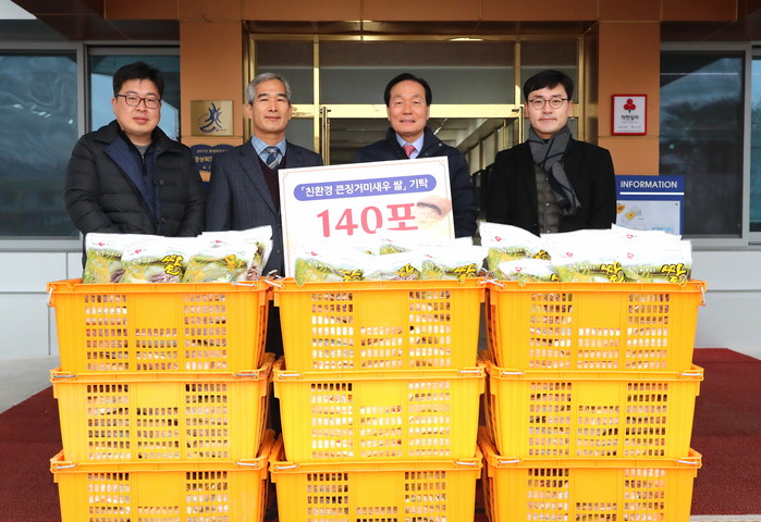 이날 기탁된 큰징거미새우‧미꾸리쌀(140포)은 저소득 취약계층 100여가구에 전달된다.