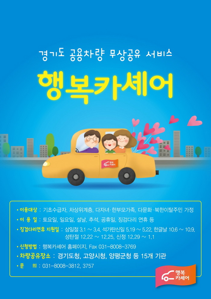 경기도내 시군이 명절연휴기간 중 행복카셰어를 임시 운행한 사례는 있지만 주말에도 행복카셰어를 운행하는 시군은 올해 1월 양평군에 이어 고양시가 두 번째다. 도는 지원차량 지역편중 현상 극복을 위해 시·군 확대를 추진하고 있다.