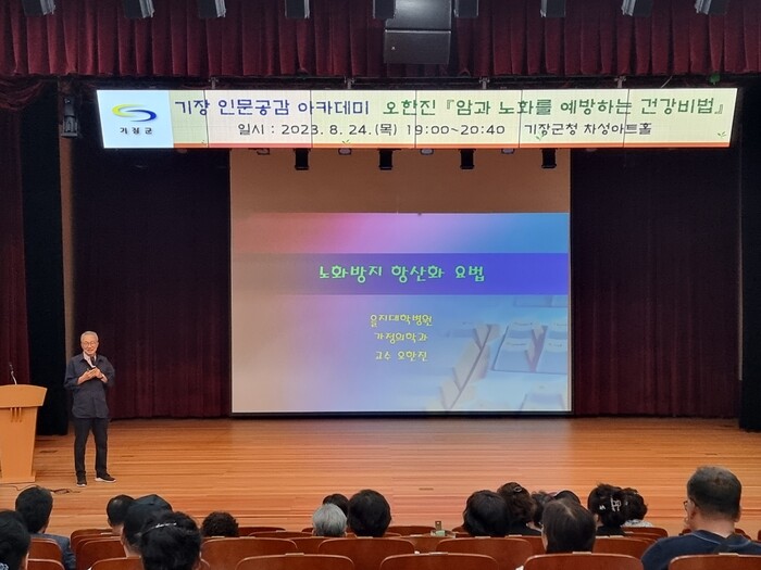 이날 오교수는 ‘암과 노화를 예방하는 건강비법’이라는 주제로 암과 노화를 예방하고 건강한 삶을 위한 먹거리 등에 대해 강연을 진행하면서 참가자들의 큰 호응을 이끌어 냈다.