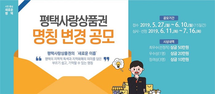 이번 공모는 평택사랑상품권의 명칭이 길고 부르기 불편하다는 시민들의 의견을 반영해 평택사랑상품권의 의미를 잘 살리면서 독창성 있고 부르기 쉬우며, 쉽게 기억할 수 있는 명칭을 공모 받는다.