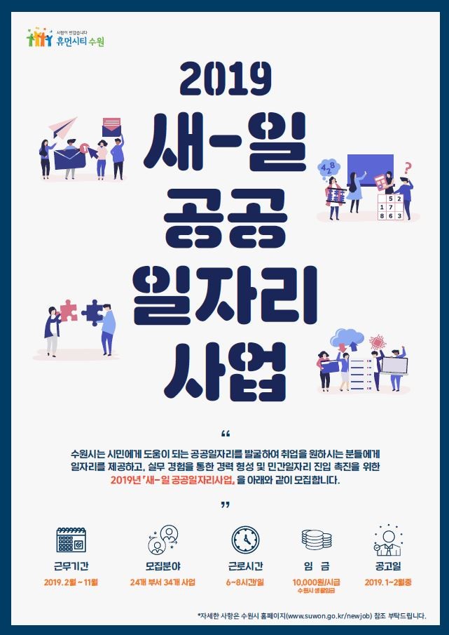 공공일자리는 부서별 채용계획에 따라 참여 대상자를 선정한다. 최종선발자는 다음달부터 11월까지 최대 10개월간 시청·구청 등에서 근무하게 되며 시급은 올해 수원시 생활임금인 1만원을 받게 된다.