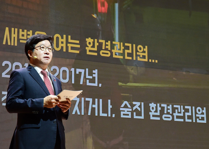 뒤편 대형화면에는 새벽 첫 차를 타는 시민들, 새벽에 일하는 환경관리원의 모습 등을 담은 영상이 상영됐다.