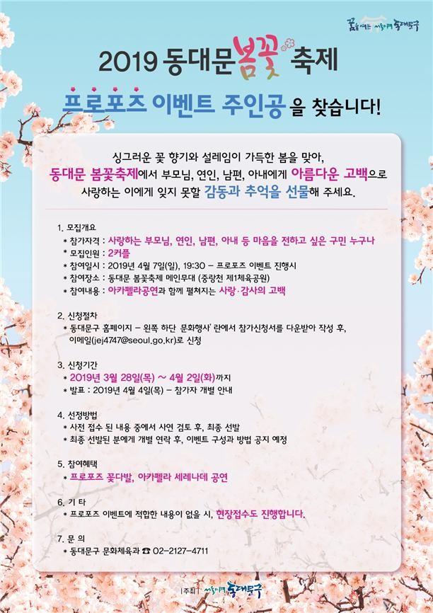 특히 깜짝 프로포즈 이벤트에서는 사전접수 및 현장접수 등을 통해 선발된 주인공이 아름다운 아카펠라 공연을 배경으로 사랑하는 부모님, 연인, 아내, 남편에게 잊지 못할 프로포즈를 펼친다. 구는 4월 2일까지 구 홈페이지(www.ddm.go.kr) ‘문화행사’란을 통해 이벤트 참여자를 모집한다.