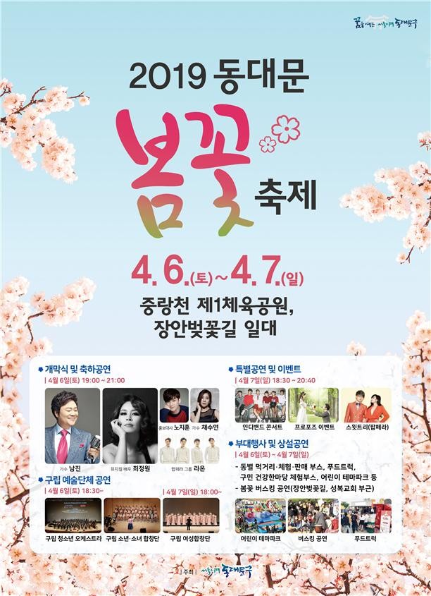 [로컬세계 임종환 기자]서울 동대문구(구청장 유덕열)가 벚꽃 개화시기에 맞춰 오는 4월 6일부터 7일까지 중랑천 제1체육공원 및 장안벚꽃로에서 ‘2019 동대문 봄꽃축제’를 개최한다.