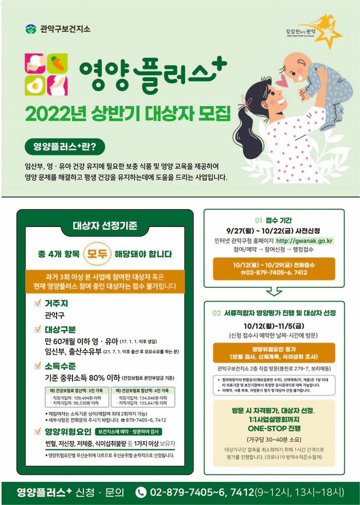 [로컬세계 임종환 기자]서울 관악구가 임산부 및 영유아의 건강한 식생활과 영양개선을 위한 ‘2022년 상반기 영양플러스 사업’ 참여자를 모집한다고 23일 밝혔다.