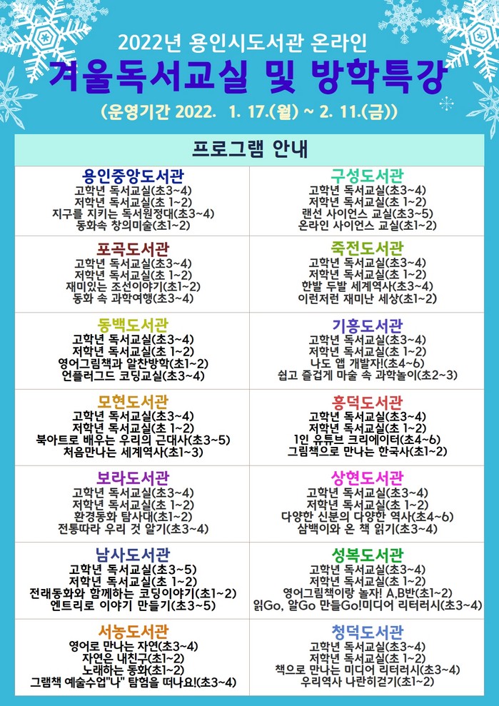 [로컬세계 김병민 기자]경기 용인시 도서관사업소가 겨울방학을 맞은 어린이들을 위한 ‘2022년 온라인 겨울독서교실 및 방학특강’을 준비했다.