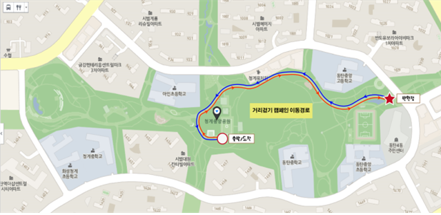 참가자들은 ‘지구를 위해 화성에서 걷자’고 외치며 청계중앙공원 큰 정자 앞에서 출발해 동탄중앙고등학교, 동탄4동주민센터 옆 공원 입구 반환점을 돌아 다시 출발지로 되돌아오는 거리 캠페인을 전개했다.