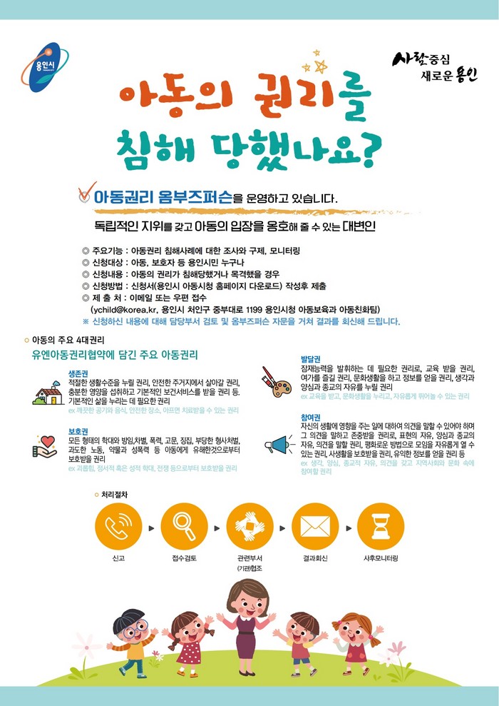 [로컬세계 김병민 기자]경기 용인시가 아동의 권리 증진을 위해 ‘아동권리 옴부즈퍼슨 상담 서비스’ 운영에 나섰다.
