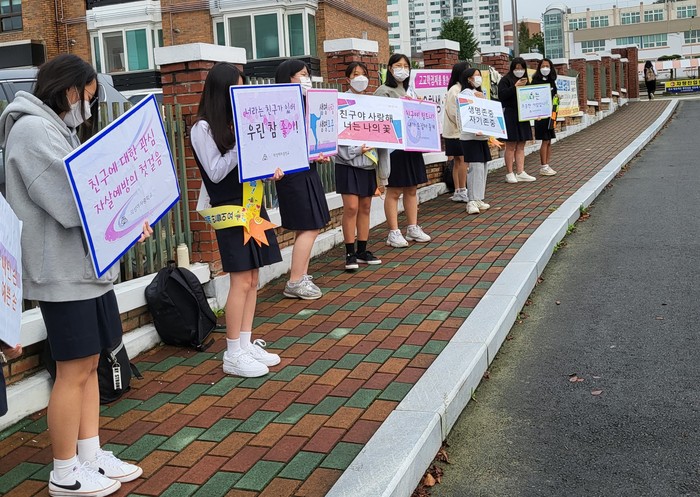 학생들은 ‘친구야 사랑해 너는 나의 꽃’, ‘너란 존재 나란 존재 우리 모두 소중해’, ‘내가 싫은 일은 친구도 싫어해’ 등 메시지가 적힌 피켓을 들고 등교하는 친구들을 응원했다.