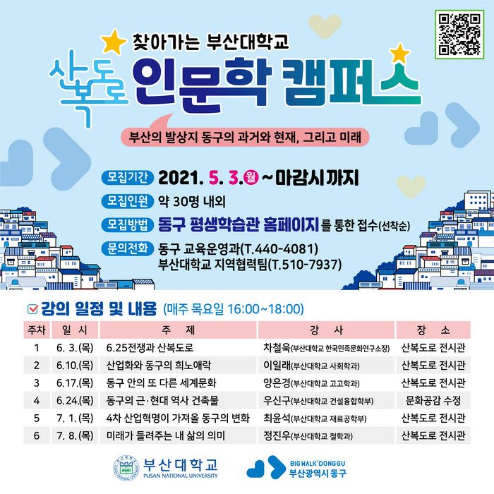 산복도로 인문학 캠퍼스는 6월 3일부터 매주 목요일 오후 4시에 망양로 산복도로 전시관과 문화공감 수정에서 6차시로 개최되며, 코로나-19 상황을 고려하여 수강생은 30명 이내로 제한했다.
