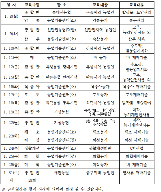 이번 교육은 종합반(밭작물, 농약안전사용 등)과 대전의 주요작목(포도, 배, 버섯 등) 포함 11개 과정으로, 19회에 걸쳐 농업기술센터 및 각 지역 교육장에서 추진한다.