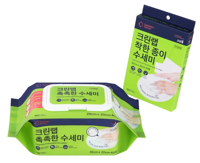 ‘크린랩 착한 종이 수세미’는 위생과 환경을 고려한 건식형 세제 수세미다. 100% 천연펄프를 사용해 친환경적이면서도 내구성이 우수해 양이 많은 설거지에도 쉽게 찢어지지 않는다. 포장 또한 폴리백 대신 종이 케이스로 대체하여 환경 부담을 줄이고 친환경성을 높였다. 10매씩 소량 포장된 케이스의 우측 절취선을 뜯어 한 장씩 꺼내 쓸 수 있어 편리하며, 헤드 고리가 달린 디자인으로 야외 활동 시 걸어두고 사용하기에도 좋다.