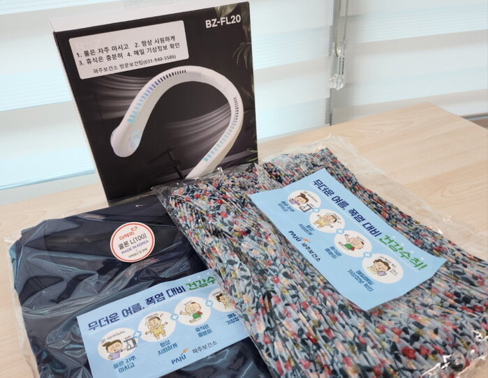 ▲ 쿨바지, 쿨티셔츠, 휴대용 선풍기, 살충제가 담긴 폭염대비 물품꾸러미.(파주시 제공) |