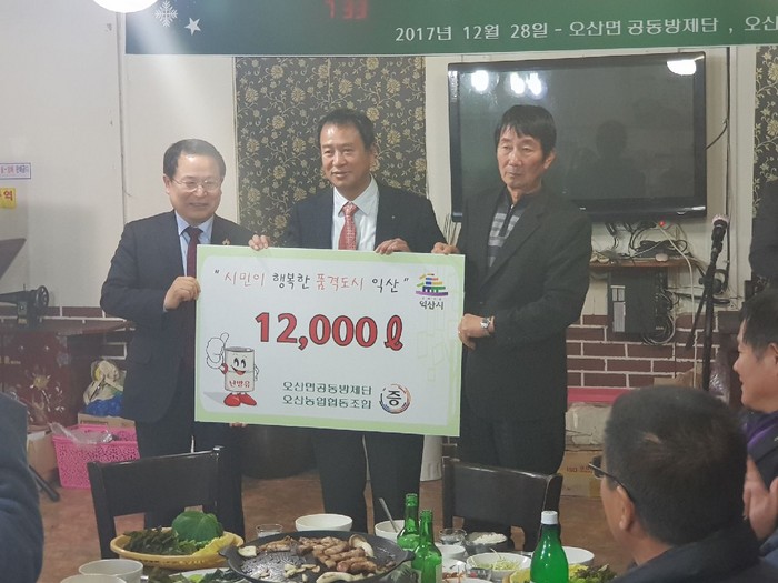 [로컬세계 양해수 기자]전북 익산시는 오산농협이 지난 28일 조합원 송년회에서 저소득층 지원을 위한 이웃사랑 행복나눔 난방용 유류(1000만원 상당)를 익산시에 기탁했다고 29일 밝혔다.