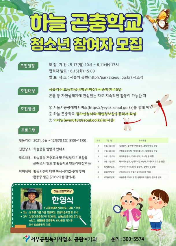 제1기 ‘하늘 곤충학교’는 한영식(봄여름가을겨울 곤충도감 저자) 곤충학교장 지도하에 서울 거주 초등학교 4학년부터 중학교 3학년까지 무료로 참여할 수 있다. 활동기간은 금년 6월부터 12월까지 월1회, 2시간 활동을 기본으로 한다.