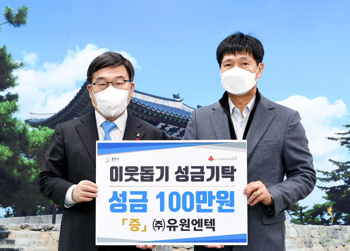 또한, ㈜유원엔텍 이영섭 대표는 지난 17일 광주시청을 방문, 광주시의 어려운 이웃에게 조금이나마 도움이 됐으면 한다며 성금 100만원을 전달했다.