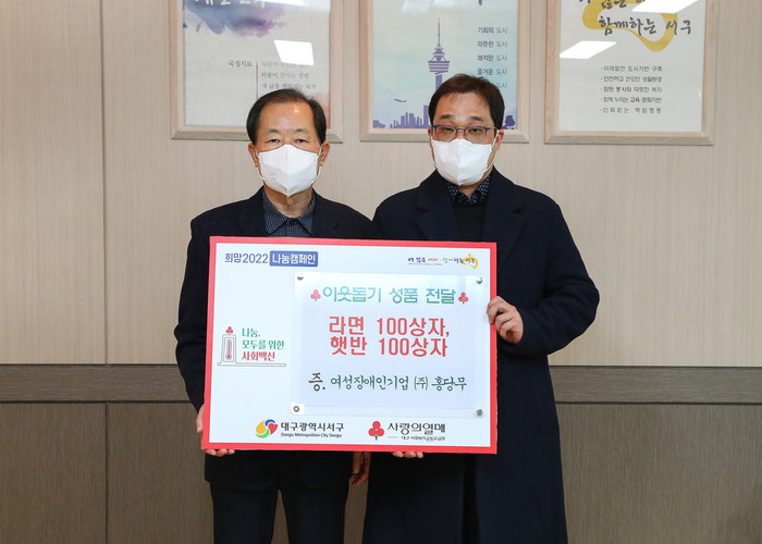 [로컬세계 박세환 기자]여성장애인기업 ㈜홍당무(대표 변순영)는 지난 17일 대구 서구청을 방문해 라면 100상자, 햇반 100상자(400만원 상당)를 전달했다.