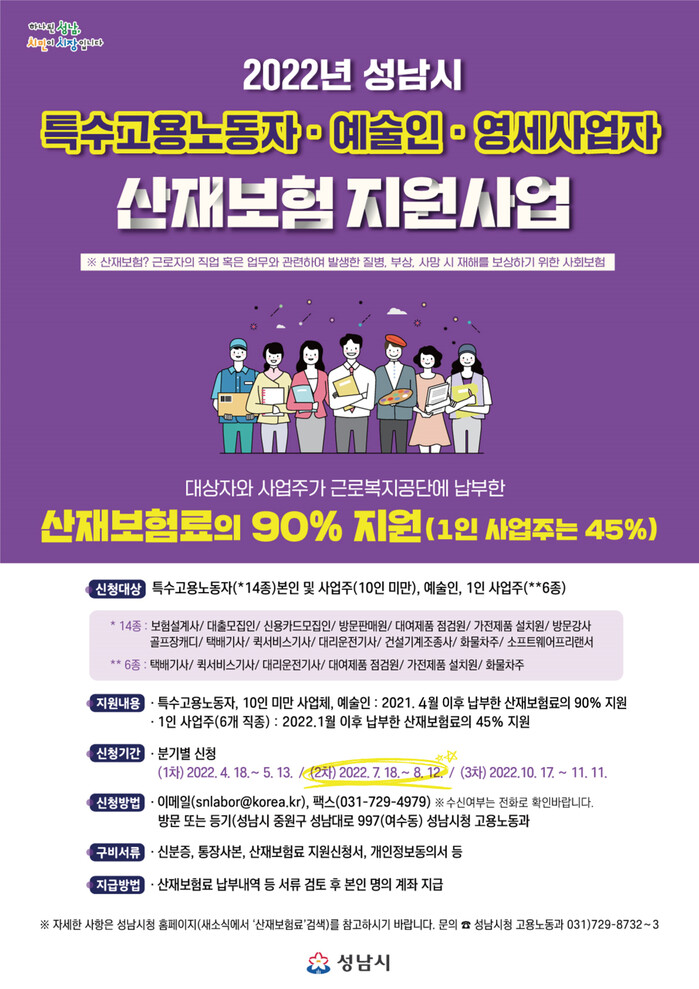 [로컬세계=김병민 기자]경기 성남시는 오는 8월 12일까지 특수고용직, 예술인, 1인 사업주를 대상으로 2차 산재보험료 지원신청을 받는다.