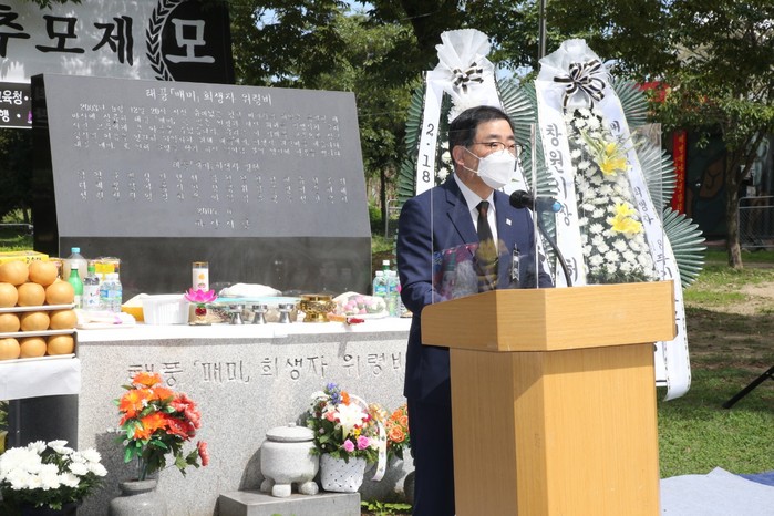 ▲허성무 시장이 12일 마산합포구 해운동 태풍매미 추모공원에서 열린 '태풍 매미 희생자 18주기 추모제'에서 추도사를 하고 있다. 창원시 제공 |
