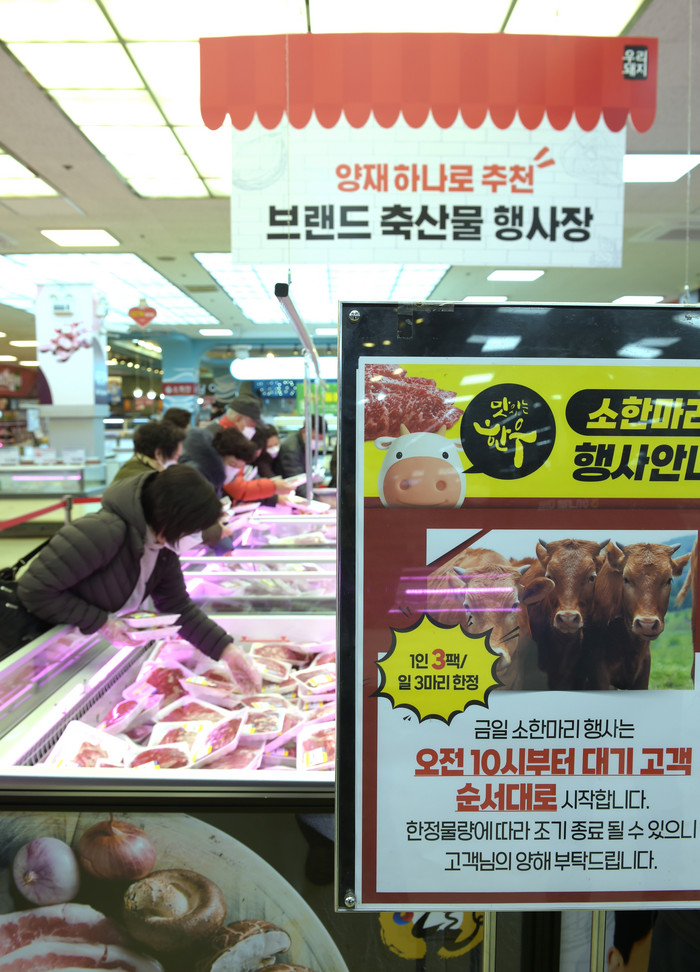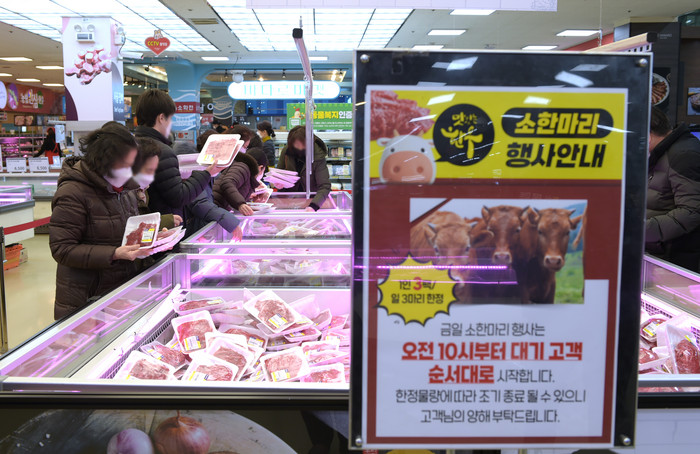| ▲24일(목) 서울 서초구 하나로마트 양재점에서 ‘소 한 마리 파격 할인 행사’가 열리는 가운데 고객들이 다양한 한우 부위를 고르고 있다. 하나로마트 양재점에서는 24일(목) ~ 26일(토) 행사기간 동안 안심, 등심, 국거리 등 최대 41% 할인 판매한다. 식탁 물가 안정에 앞장서기 위해 소 한 마리 파격 할인 행사는 매월 넷째 주에 정기적으로 실시할 예정이다. 농협유통 제공 |