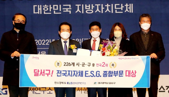 ESG행복경제연구소가 발표한 ‘기초자치단체 ESG 평가지수’에 따르면 달서구는 환경·사회적가치·거버너스 전 부문에서 모두 A등급(우수)을 받았으며 기후변화 대응과 친환경 생활, 아동보호정책 및 교통문화, 한국매니페스토 평가와 주민참여 활동 등에서 높은 점수를 받았다.