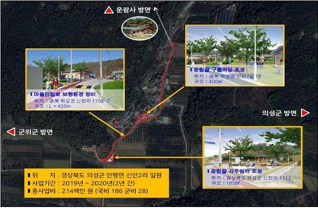 또한 고령친화적공간정비사업인 ‘안전하고 정감 넘치는 시골 마을 운람골’은 지역주민의견을 충실히 반영하고 자발적인 주민 참여가 돋보이는 사업으로 마을 내 방치된 폐건물을 정비하고 야외 생활 쉼터 조성 및 보행환경 개선을 통해 지역 주민에게 안전하고 쾌적한 생활공간을 제공함으로써 주민 수혜도가 가장 높은 사업이 될 것으로 예상되며 사업비는 2.2억원(국비1,9억원, 지방비0.3억원)이 투자될 예정이다.