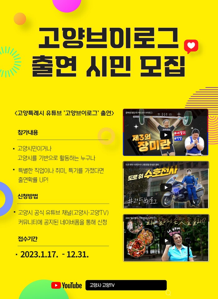 [로컬세계 = 이영원 기자]경기 고양특례시(시장 이동환)가 고양시 공식 유튜브 채널 고양TV의 ‘고양브이로그’ 프로그램에 출연할 시민을 연중 모집한다.