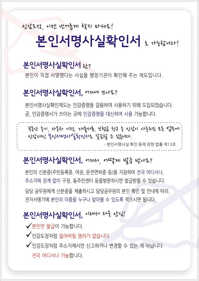 본인서명사실확인제도란 증명 신청자가 직접 행정기관을 방문해 본인이 서명했다는 사실을 행정기관이 확인해주는 제도로 인감증명서의 발급비용, 인감의 제작 및 보관 등에 소요되는 시간과 비용을 절감하고자 한다.