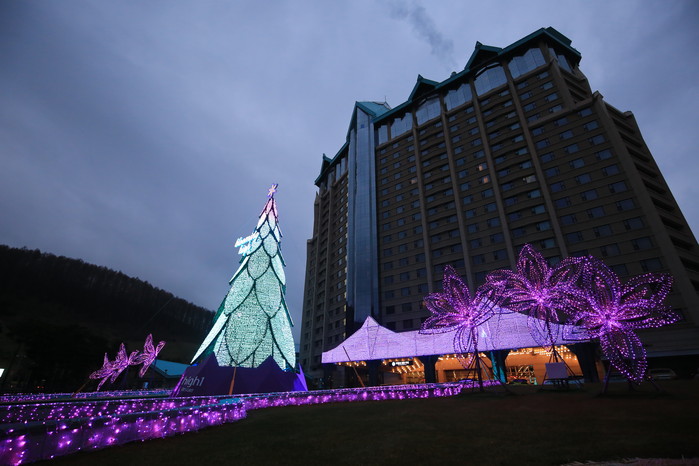 ▲크리스마스를 맞아 그랜드호텔에 미디어파사드를 이용한 트리가 불을 밝히고 있다.(하이원리조트 제공) |