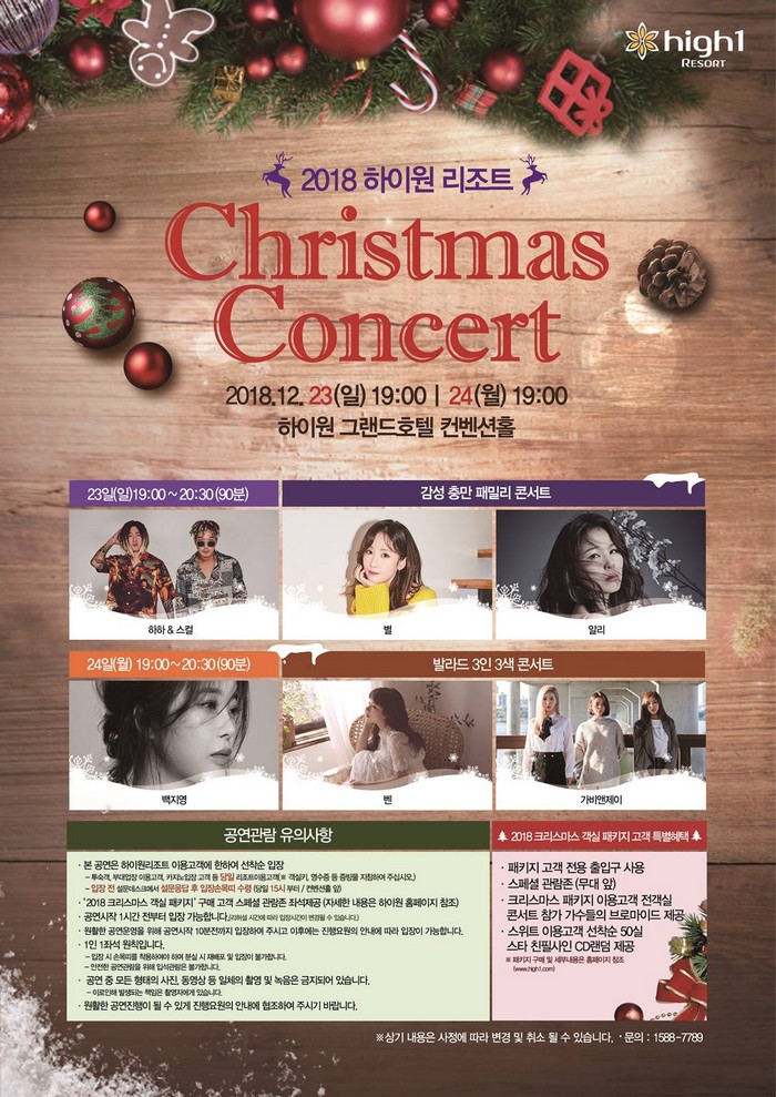 먼저 오는 23~24일 양일간 강원랜드 그랜드호텔 컨벤션홀에서 ‘2018 하이원리조트 크리스마스 콘서트’가 열리며 인기가수들이 뜨거운 공연을 선보인다.