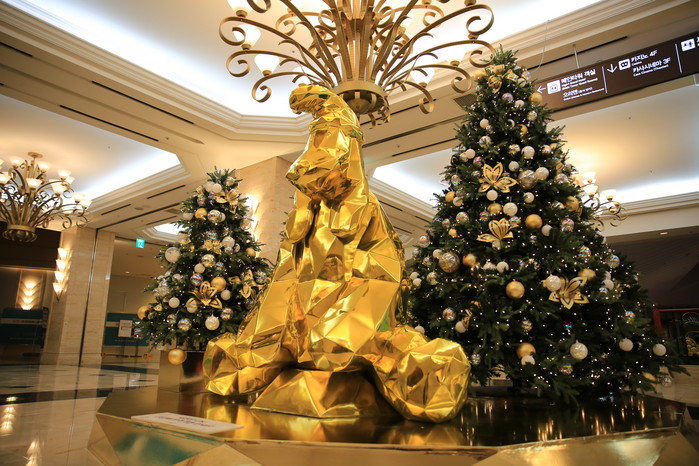 ▲하이원리조트 그랜드호텔 로비에 마련된 크리스마스 트리와 하이하우 조형물(중앙) 사진. |