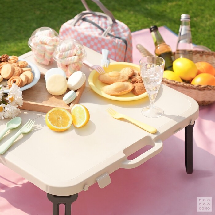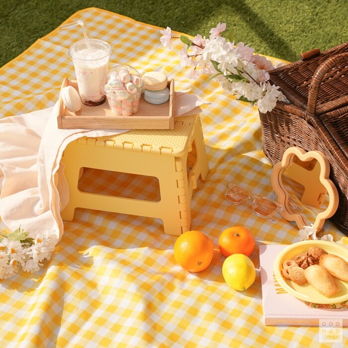 야외용품은 테이블과 의자, 돗자리로 구성했다. 나들이 뿐만 아니라 캠핑 무드도 연출해 볼 수 있는 ‘접이식 테이블’은 다용도 걸이가 있어 측면에 컵이나 봉투 등을 걸 수 있다. 좁은 공간에 접어서 더 효율적으로 보관이 가능해 집에서 아이들 학습용 테이블로도 사용할 수 있다. ‘접이식 스툴’은 접혀있는 부분을 바깥 방향으로 펼치면 손쉽게 조립되는 간이 의자로, 냄비나 조리 도구를 올려둘 수 있는 미니 테이블로도 활용할 수 있다.