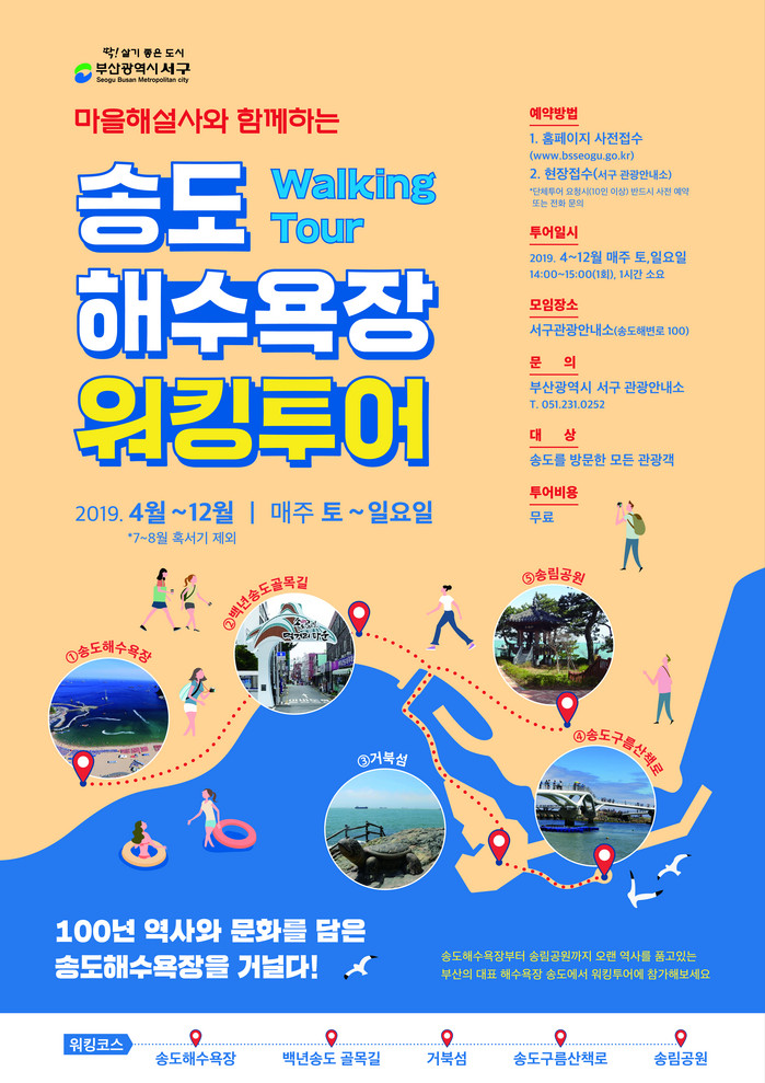 워킹투어는 4월부터 12월(혹서기 7~8월 제외)까지 매주 토·일요일 오후 2시부터 송도해수욕장~백년송도골목길~송도구름산책로~거북섬~송림공원 등 1㎞ 구간에서 1시간 가량 진행된다.